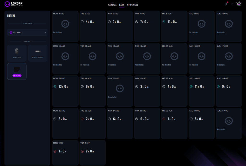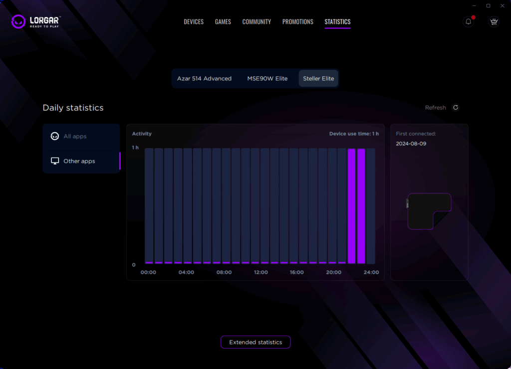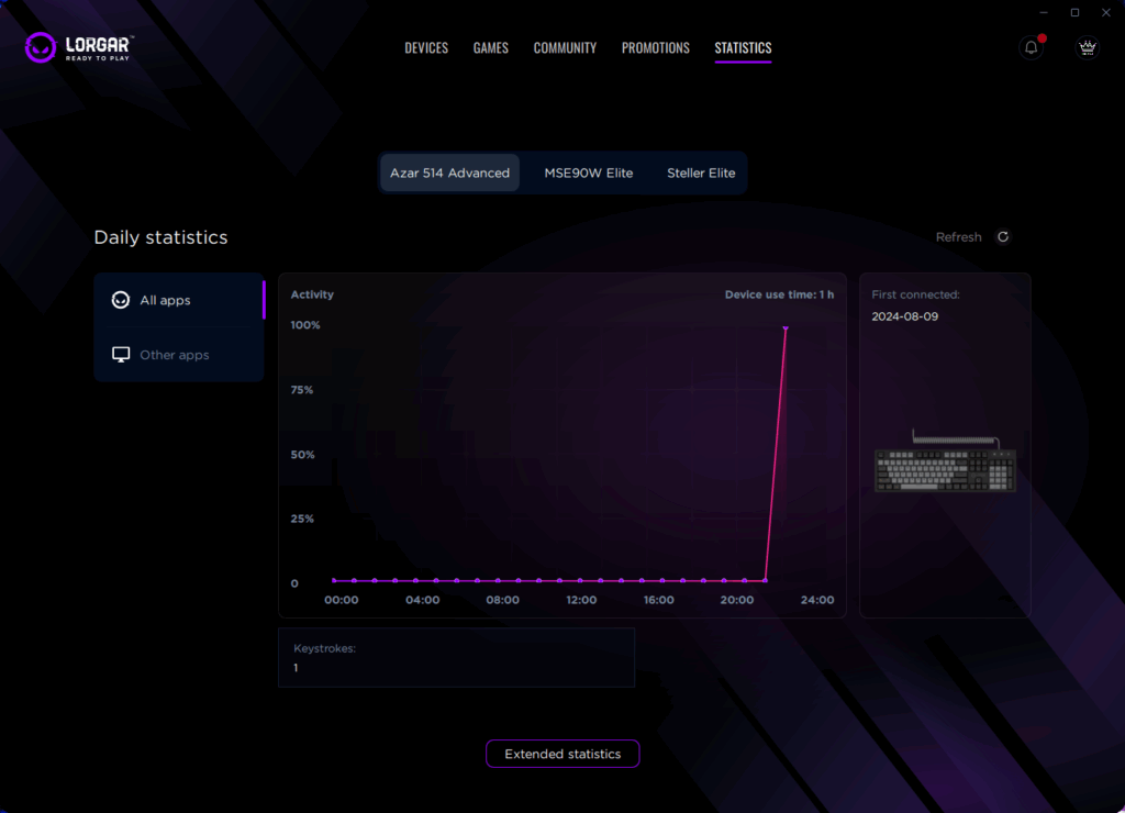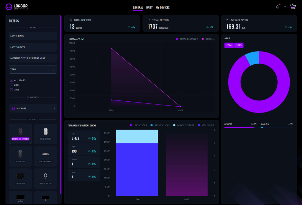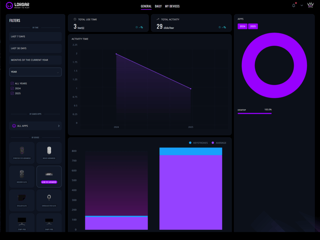 Але справжня сила лежить в Extended Statistics (вид у браузері). Це місце, де LORGAR PLATFORM переходить від простого відстеження до складних інструментів ігрової аналітики. Довгострокові порівняння показують, як далеко ви зайшли. Місячні календарі виявляють патерни – регулярні щоденні сесії чи вихідні марафони. Графіки розподілу для кнопок показують, чи ви широко використовуєте своє обладнання, чи просто молотите лівий клік.