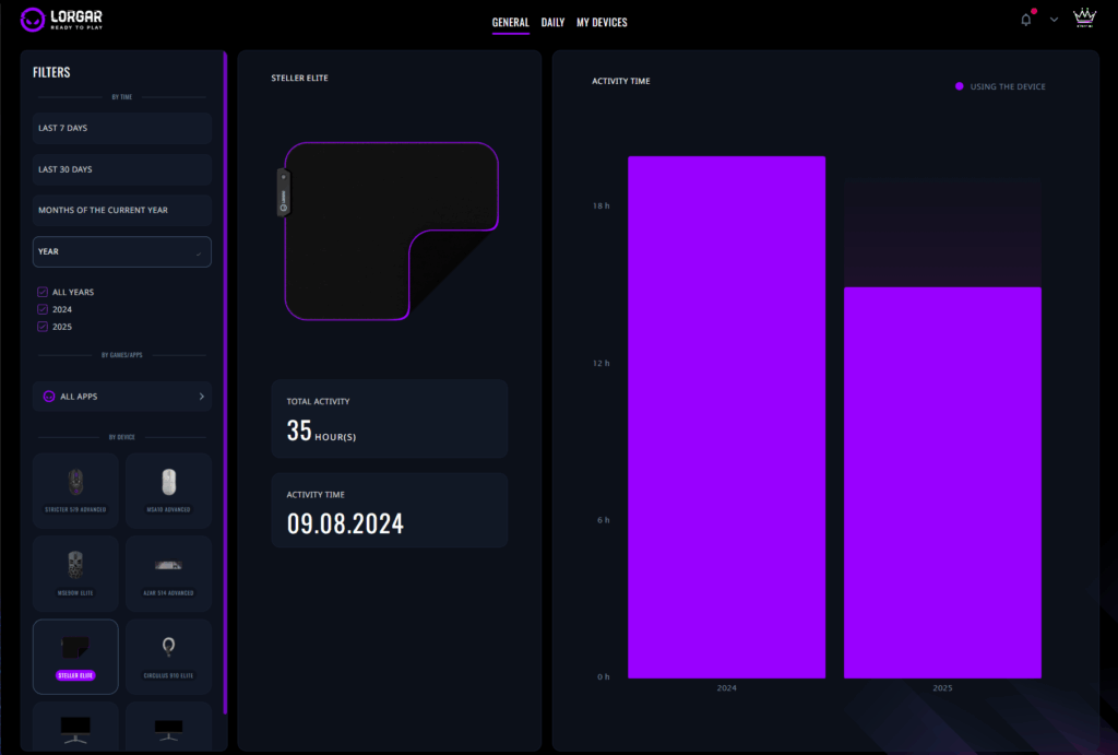 Специфічні для пристроїв інсайти – це місце, де все стає детальним. Для мишей можна подивитися весь розподіл кліків кнопок, відстань прокрутки та тенденції швидкості руху. Клавіатури показують кількість натискань клавіш та інтенсивність за сесію. LORGAR PLATFORM навіть відстежує використання килимка для миші або монітора LORGAR.