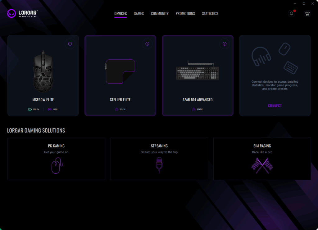 LORGAR PLATFORM легко керує кількома пристроями. Маєте три продукти LORGAR в системі? Усі вони з’являються у вкладці Devices зі своїми власними плитками, з індикаторами батареї та статусом у реальному часі, як-от DPI миші. Кожен пристрій підтримує свій власний профіль, але працюють вони разом як єдина система.