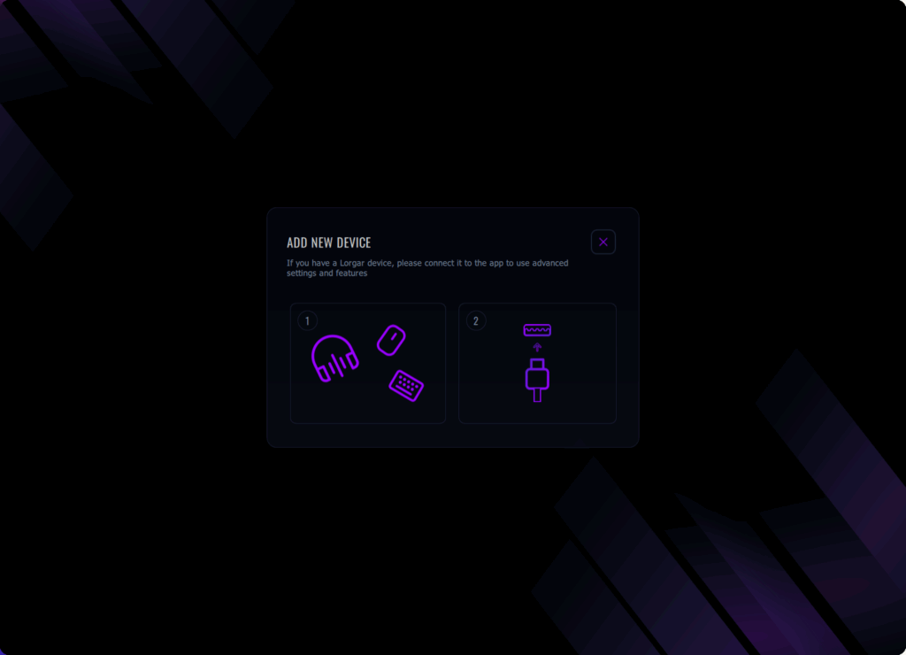 Магія починається в момент підключення пристрою LORGAR. Жодного пошуку драйверів, жодної ручної конфігурації, просто чиста простота. Натисніть «Додати новий пристрій», і вас зустріне чистий двокроковий процес. Перший крок показує ваші підключені периферійні пристрої, як-от гарнітура, миша, клавіатура – все, що у вас підключено. Другий крок? Просто підключіть через USB, і все готово. Платформа миттєво розпізнає вашу мишу або килимок і завантажує оптимальні налаштування.