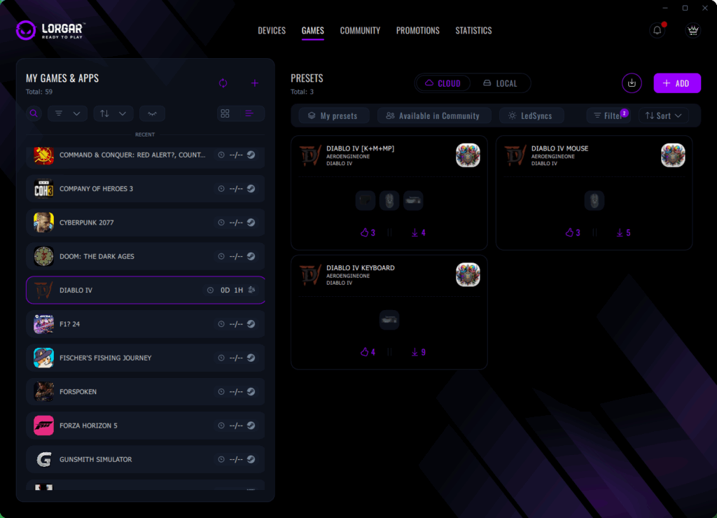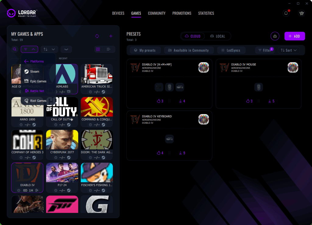 Функціональність пошуку в іграх і пресетах справді працює. Почніть набирати «Diablo», і все, пов’язане з Diablo, з’являється миттєво – ігри, пресети, навіть конфігурації спільноти. Фільтри зберігаються між сесіями, тому якщо ви завжди хочете бачити лише локальні пресети, платформа це запам’ятовує.